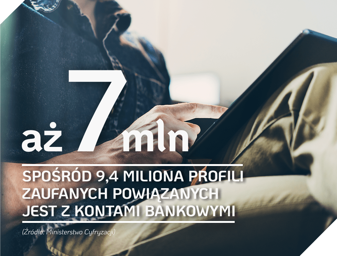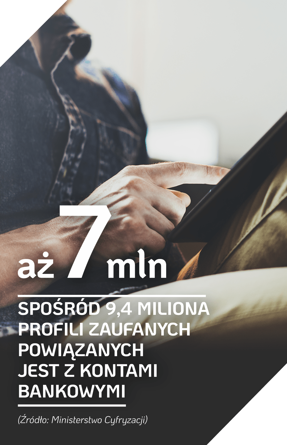 Nowoczesny bank to nie tylko instytucja, w której zarządzasz swoimi pieniędzmi, ale także drzwi do usług cyfrowej administracji. 75% Profili Zaufanych, dzięki którym załatwiasz on-line sprawy urzędowe, zostało założonych przez bankowość elektroniczną. Dzięki temu wniosek o świadczenie 500+ czy nowy dowód osobisty możesz złożyć bez potrzeby zgłaszania się w urzędzie. Wystarczy login i hasło do banku. Dziś „wizyta w urzędzie” trwa tyle, że możesz nawet nie zauważyć, jak wiele czasu właśnie udało Ci się zaoszczędzić!